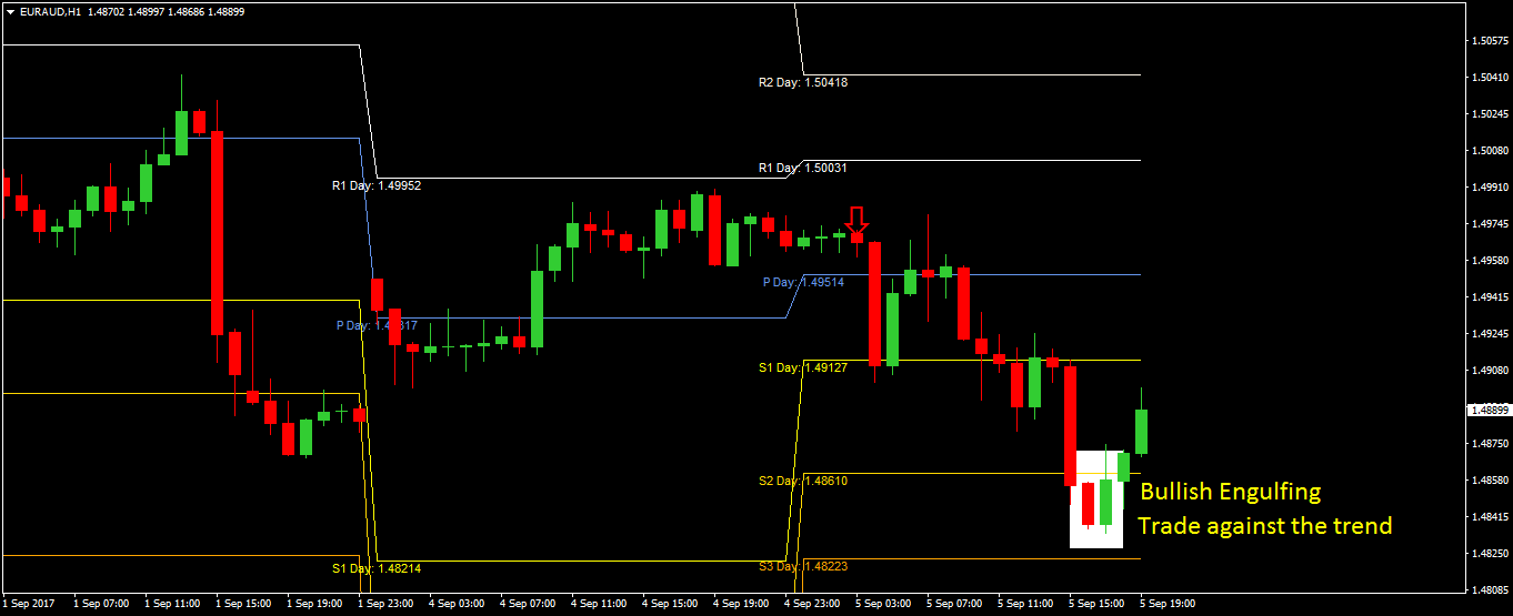 EURUSD pair in the H1 timeframe. Price was creating a bullish engulfing above the daily pivot.As usual, I've entered a long trade at the closing of engulfing candle.